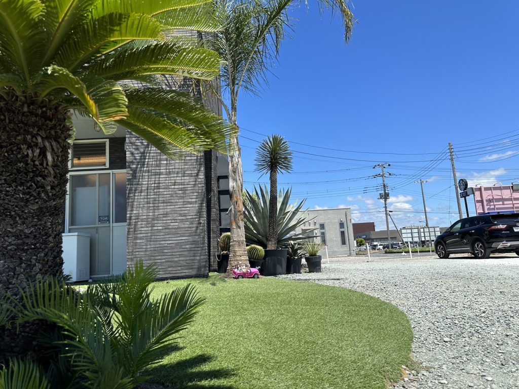 - 課題と解決: 建物がモノトーンのモダンなデザインだったため、ダイナミックで直線的な樹形のワシントンヤシを提案。周辺にはソテツや多肉植物を配置し、景観に統一感を持たせました。