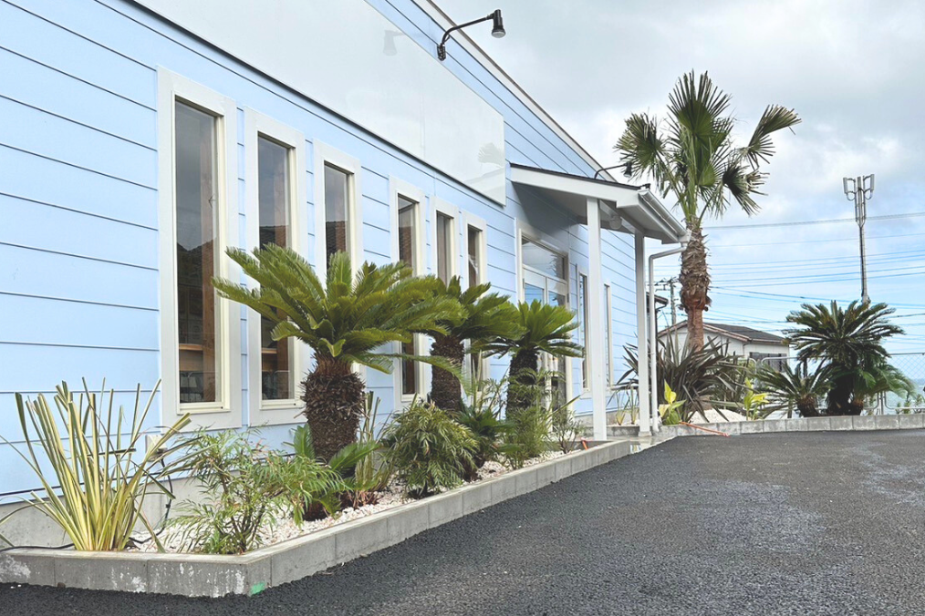 - お客様の声: 「無機質だった家屋の外観に、ヤシの生命力が加わり、まるで高級ホテルのような雰囲気に。冬も、葉をまとめてもらって無事に越冬できています。」